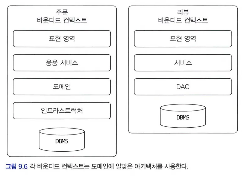 하위 도메인 모델이 섞이지 않도록 주의하위 도메인별로 기능을 확장하기 어렵게 된다.하위 도메인을 위한 모델이 서로 뒤섞이지 않고 하위 도메인마다 바운디드 컨텍스트를 갖는 효과를 낼 수 있다.
