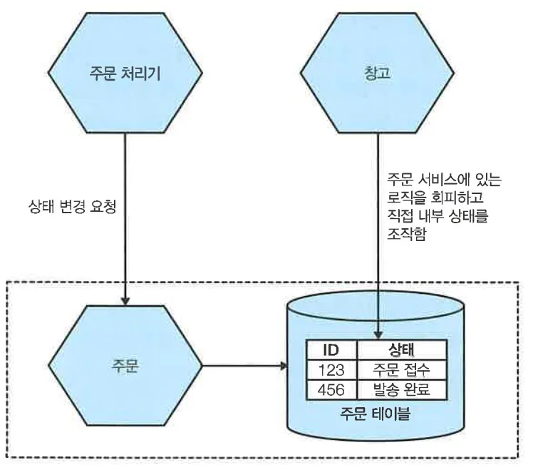 주문 처리기, 창고 모두 주문 서비스의 내부 데이터를 액세스하는 예시