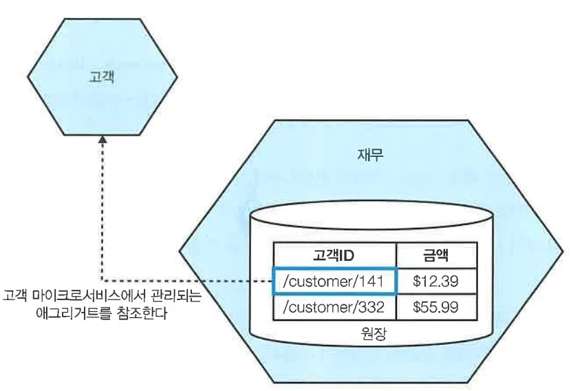 서로 다른 마이크로서비스의 두 애그리거트 간 관계가 구현되는 방식의 예시