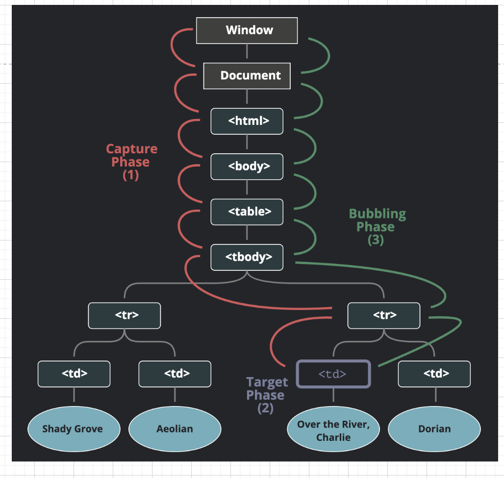 이벤트 캡처링을 더 자세히 보기 위해서 이벤트의 3단계 흐름을 살펴보겠습니다.