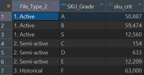SELECT File_Type_2 , SKU_Grade , count(DISTINCT SKU_number) AS sku_cnt