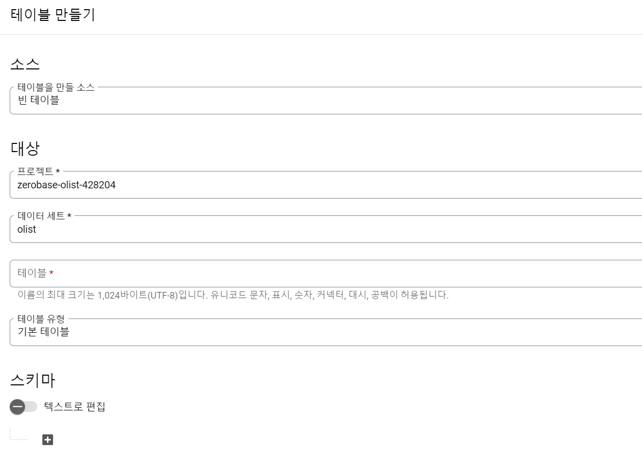 소스는 업로드, 테이블 이름 설정 후 스키마 자동감지 선택