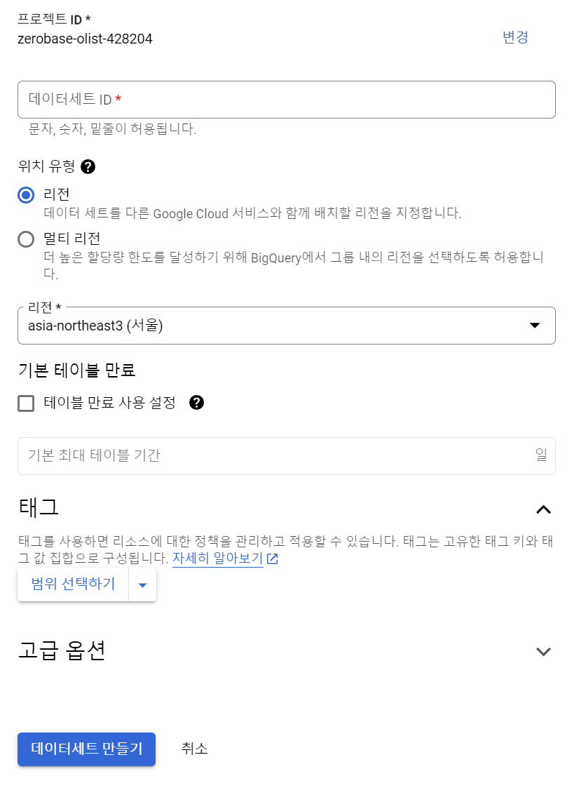 데이터 세트 이름을 설정하고 리전 선택