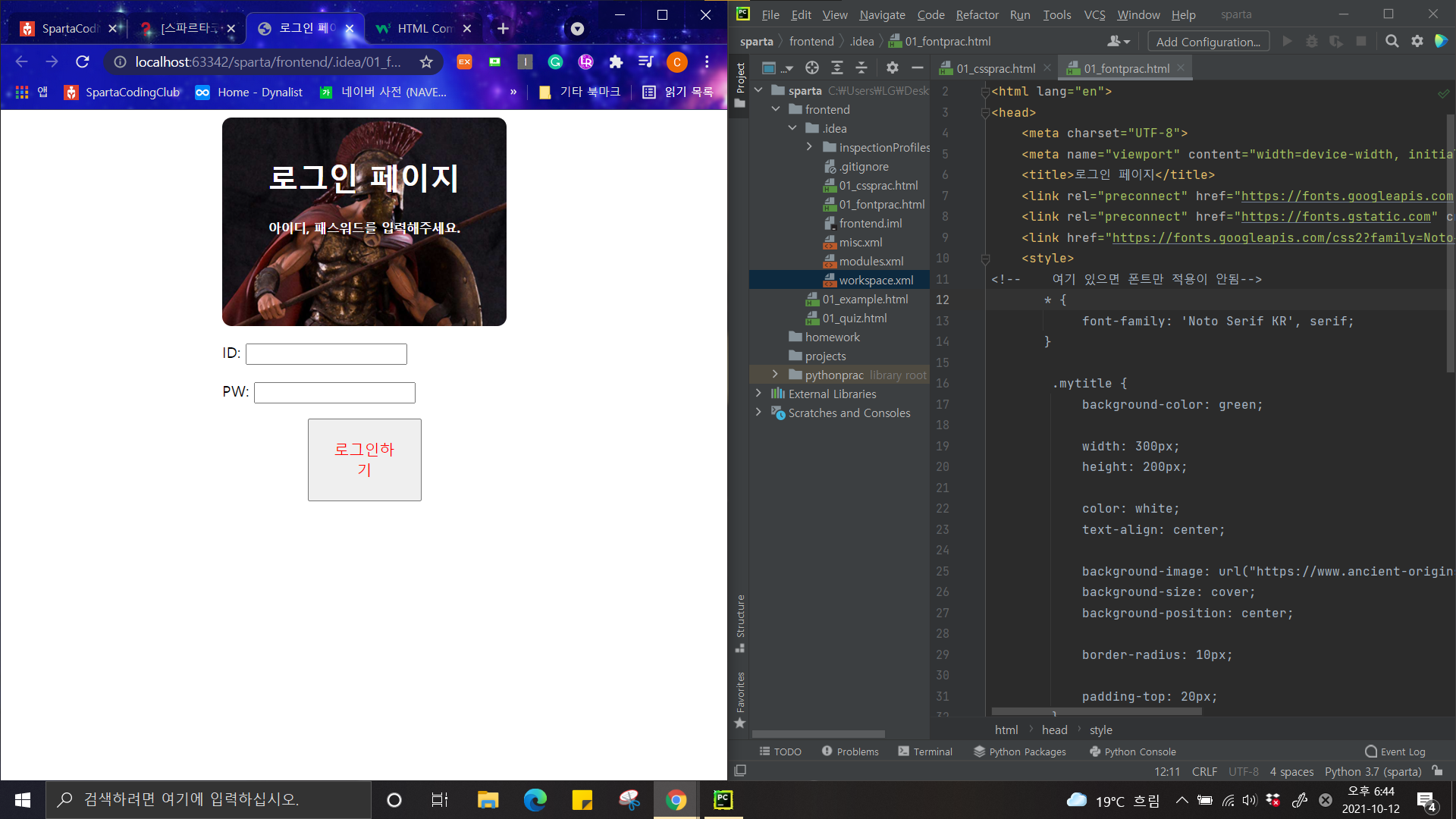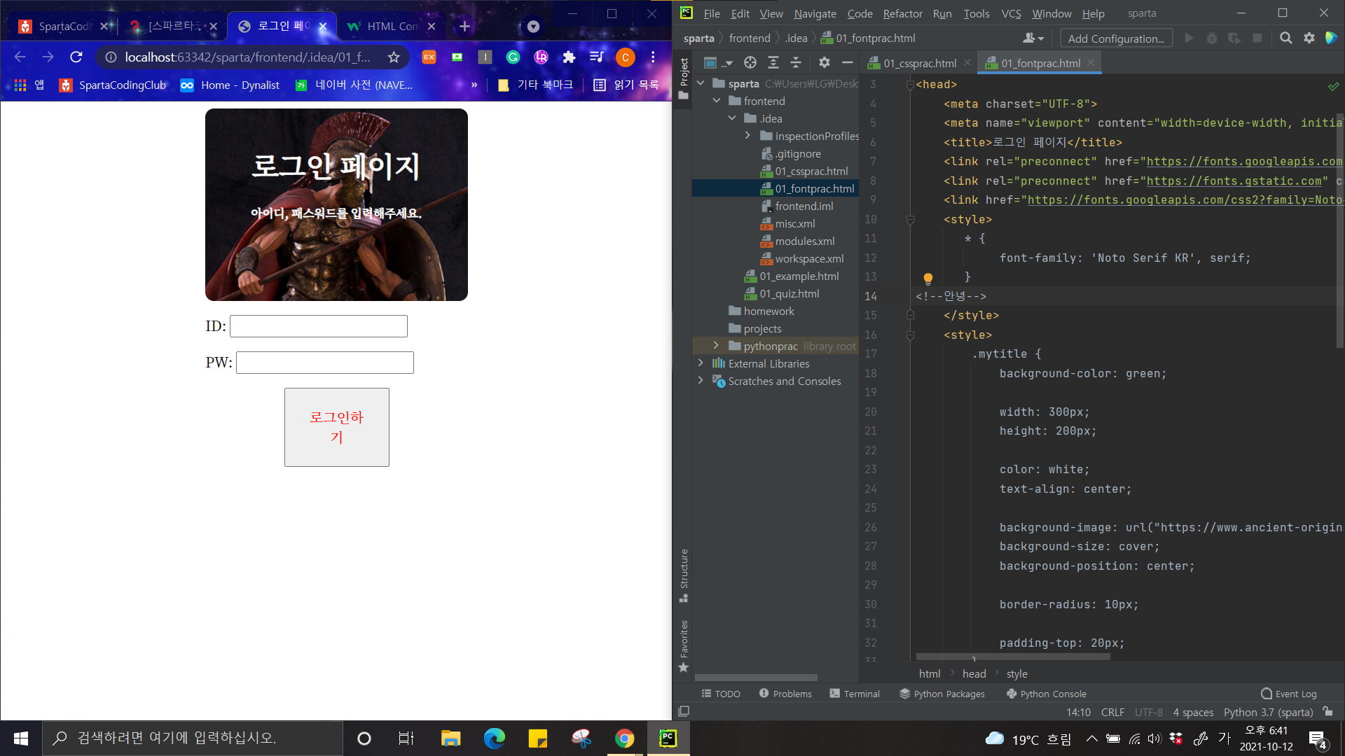 왼쪽은 HTML 구현 화면, 오른쪽은 HTML 코드 일부