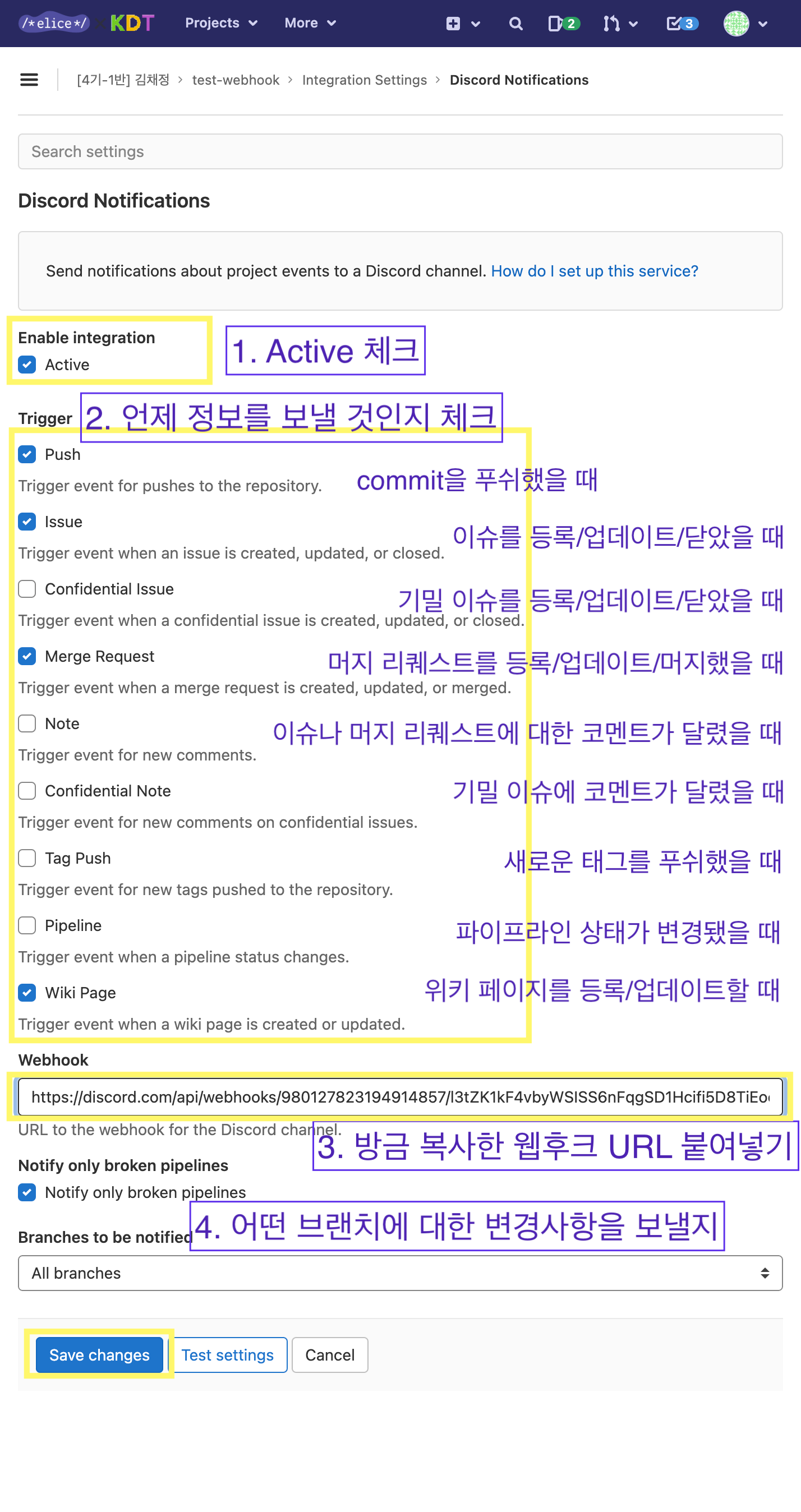 누군가 git push, merge, wiki 등록, issue 등록을 했을 때 Discord 채널로 바로 메시지를 보내는 것이다.