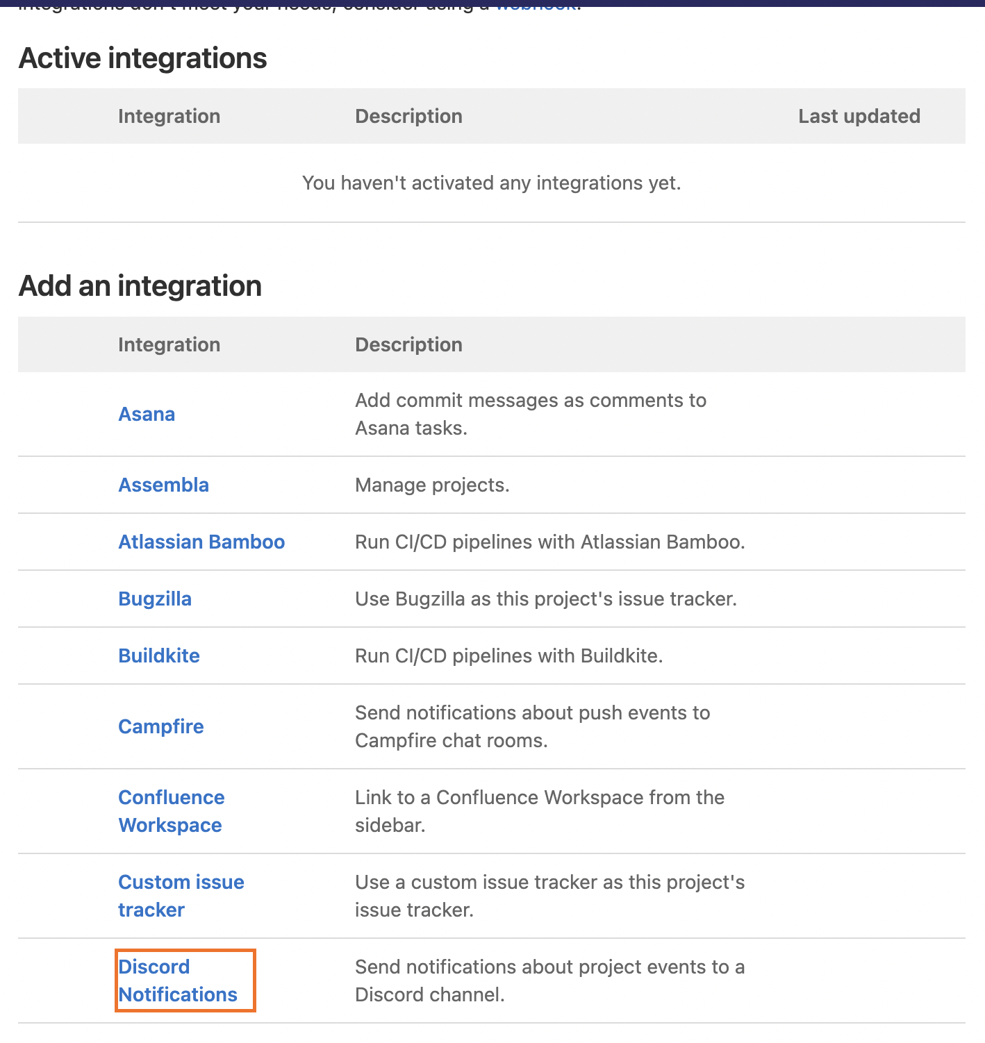 Add an integration 항목에서 내리다 보면 Discord Notifications가 있습니다.