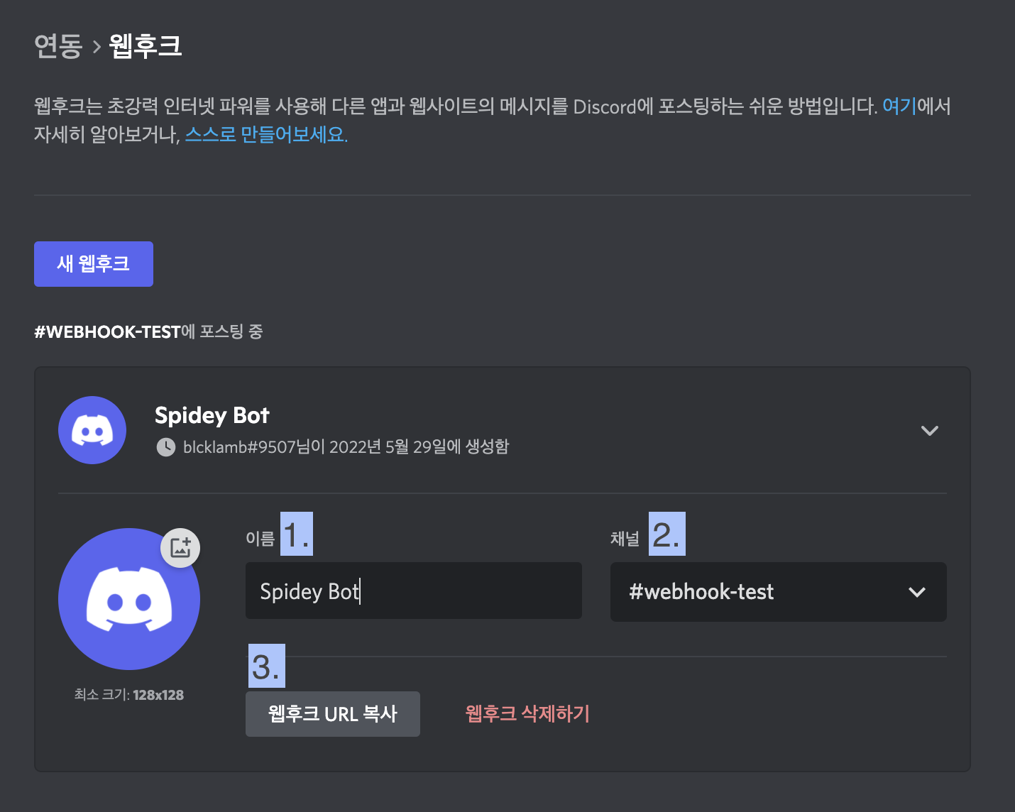 마지막으로 웹후크 URL 복사를 클릭!