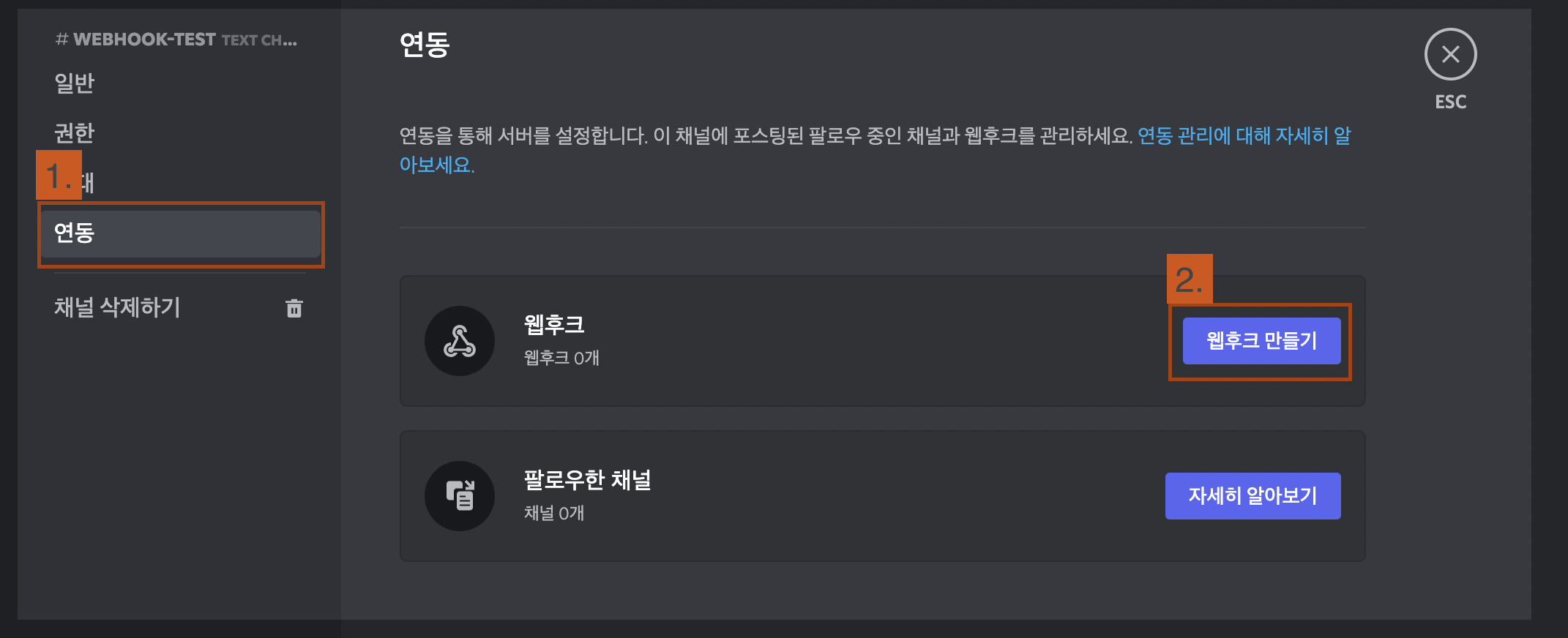 연동 탭에서 웹후크 만들기 클릭!