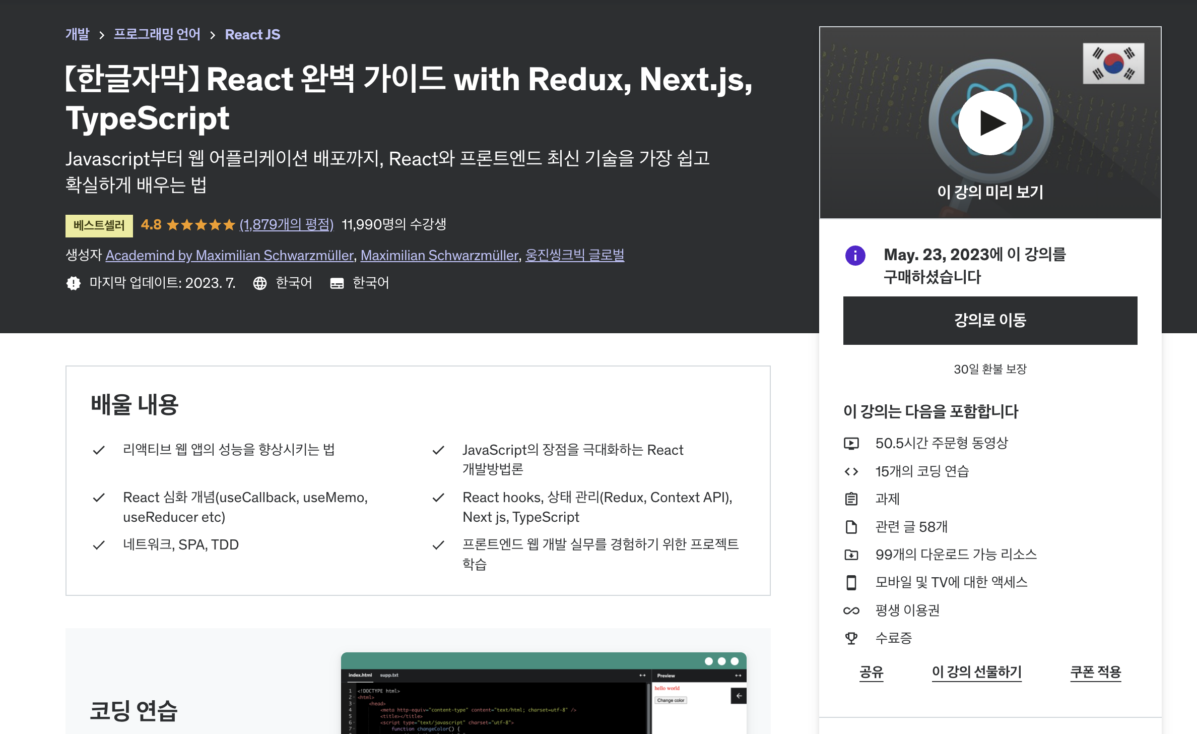 React로 프로젝트를 제일 많이 했지만 누구보다도 React를 모르고 있다는 것을 과제테스트나 면접에서 느껴버렸다. 그래서 택하게 된 강의, 비록 양은 좀 많지만 내가 부족한 부분을 확실히 채우기 위해 열심히 들어보도록 하겠다.