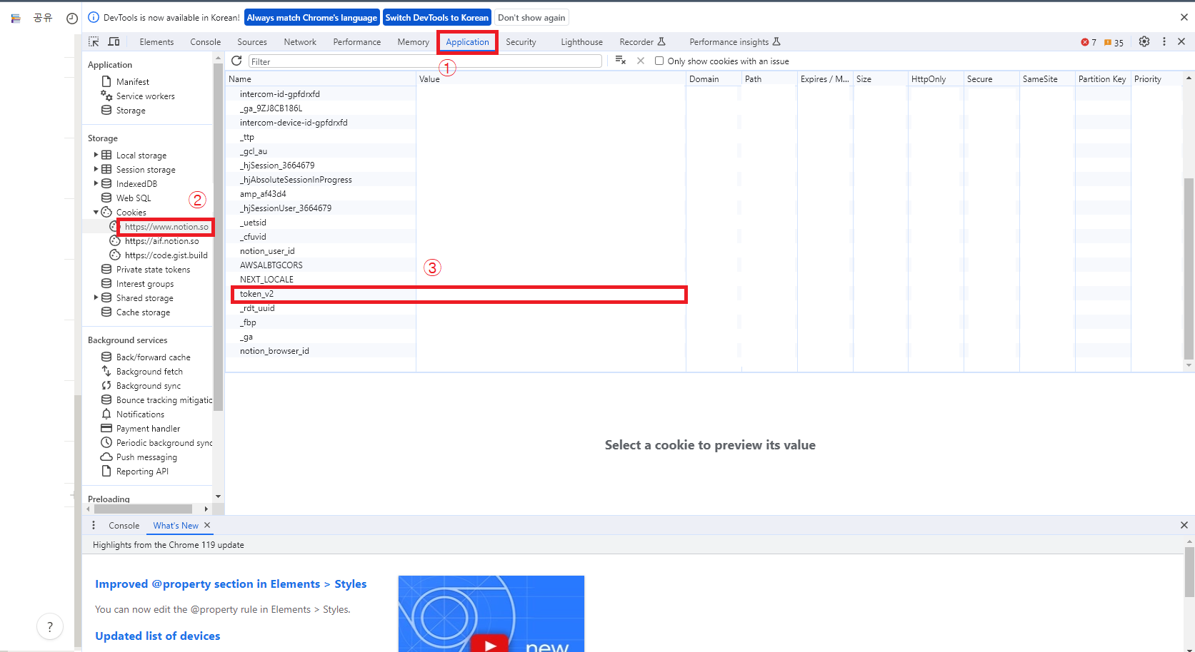 ② 좌측 탭에서 ‘Cookies’에 ‘https://www,notion.so’ 에서 token_v2를 찾는다.