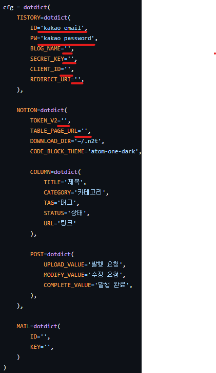 4. N2T 폴더 내의 config.py파일에 지금까지 복사해둔 정보들을 입력한다