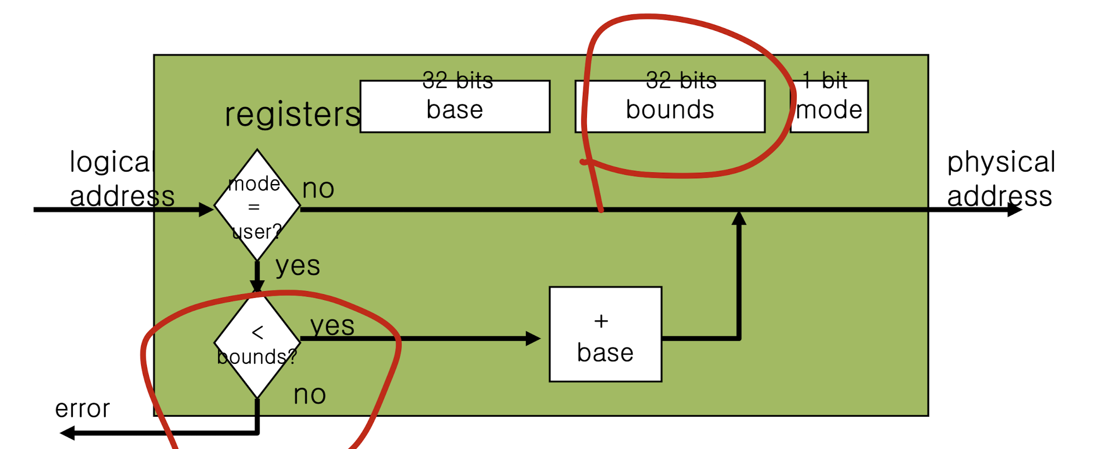 - context switch가 일어날 때, Base, Bounds register는 PCB에 저장되어야 함