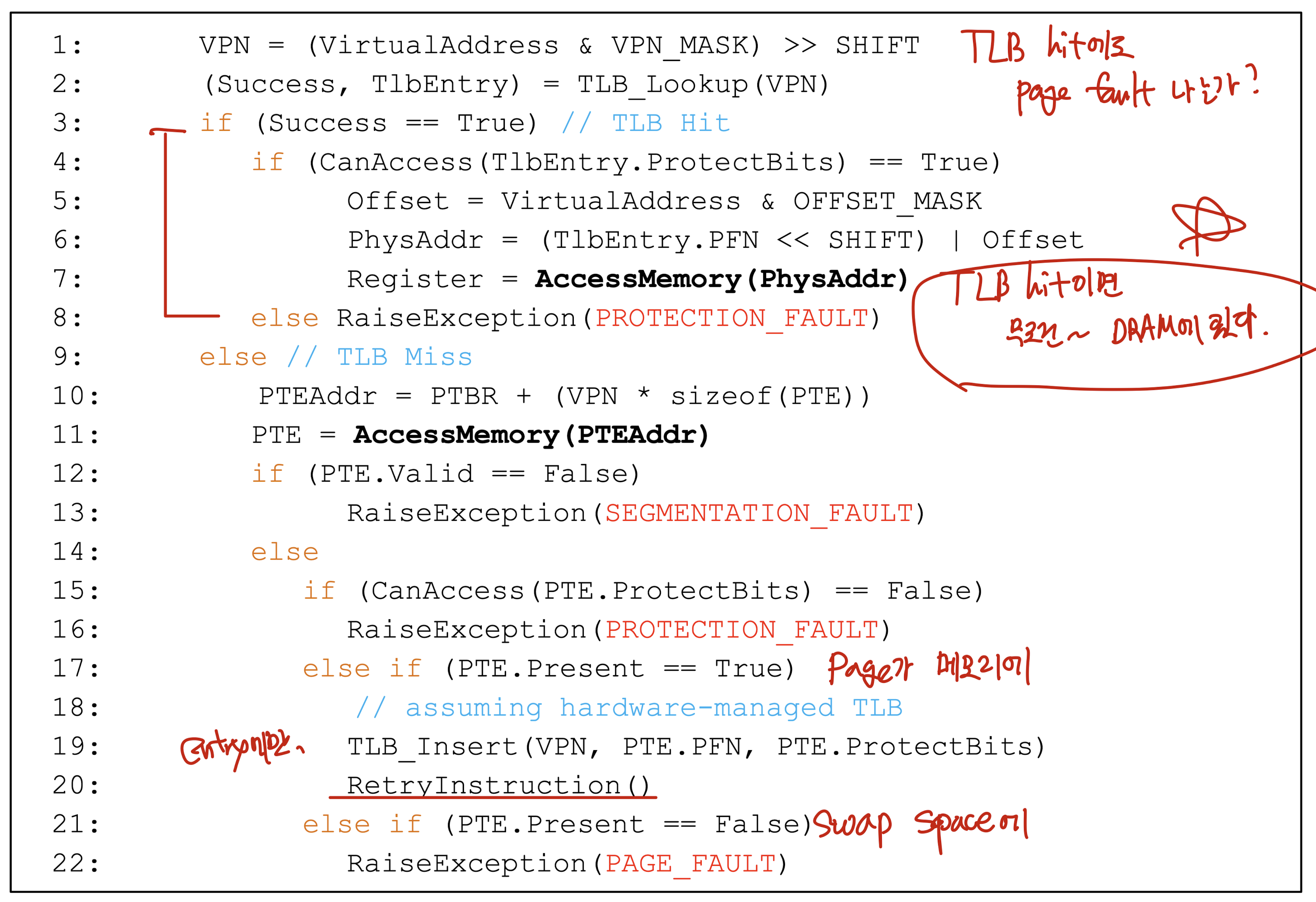 17 : page는 memory에 있는데 TLB miss인 경우