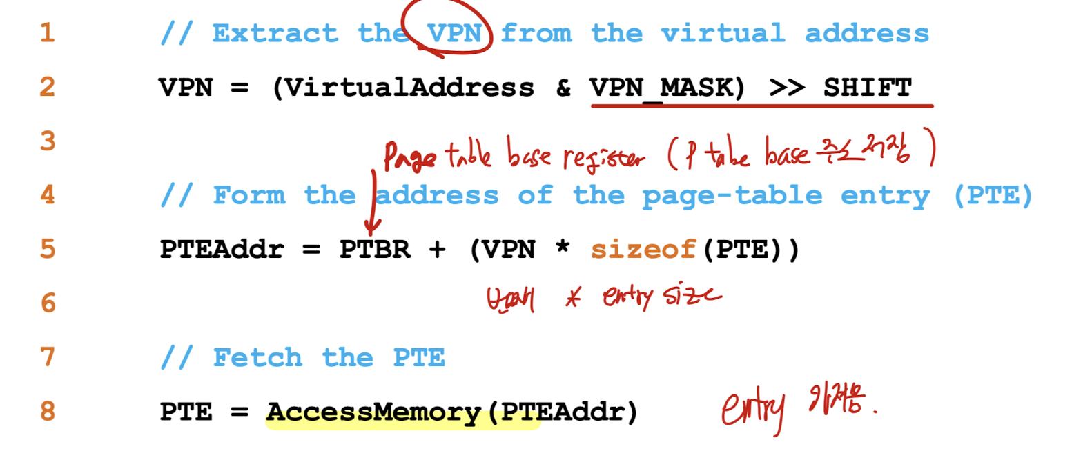 (5번 줄) PTBR : Page Table Base Register