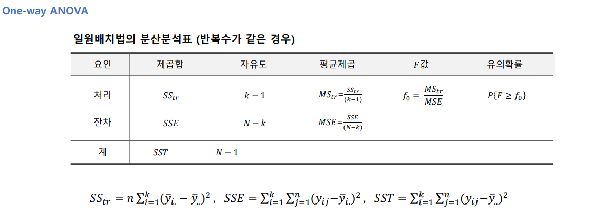 분산분석인 이유: 모집단의 평균들을 비교하기 위하여 특성값의 분산 또는 변동을 분석하는 방법, 실험을 통해 얻은 편차의 제곱합을 통해 평균의 차이를 검정