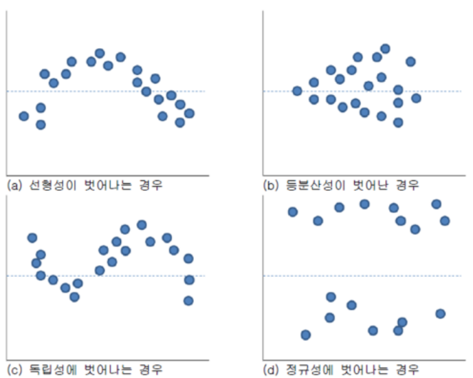 d) 정규성을 벗어나는 경우: Normal Q-Q plot으로도 확인, 잔차가 -2 ~ +2 사이에 분포해야 함, 벗어나는 자료가 많으면 독립성 가정 위배