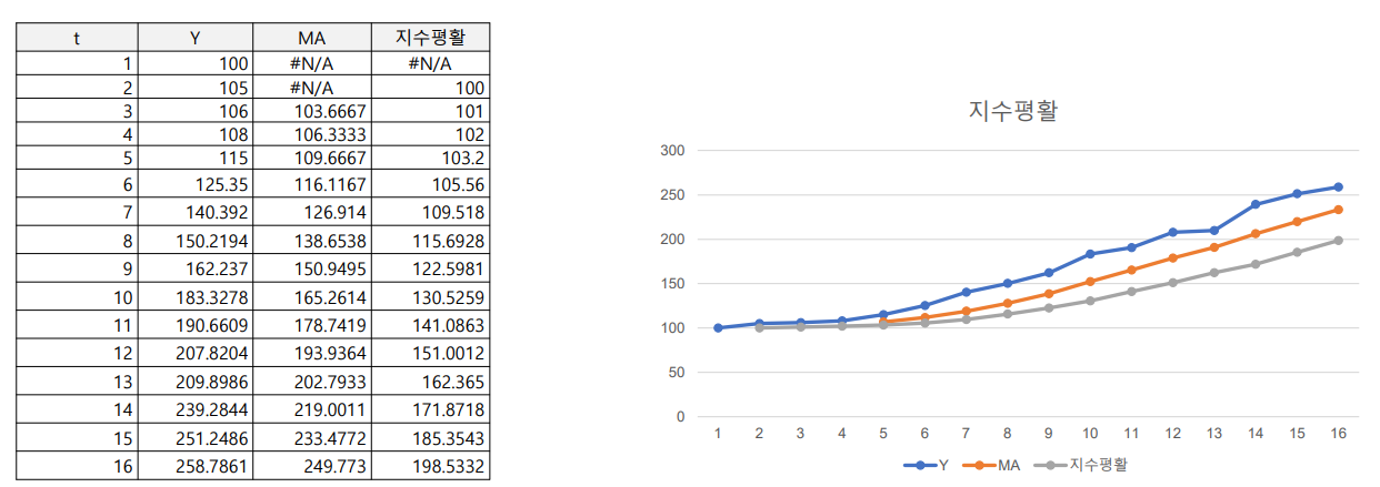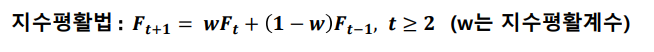 지수평활법: 현재에 가까운 시점에 가장 많은 가중치 주고 멀어질수록 낮은 가중치를 주어서 미래를 예측하는 방법