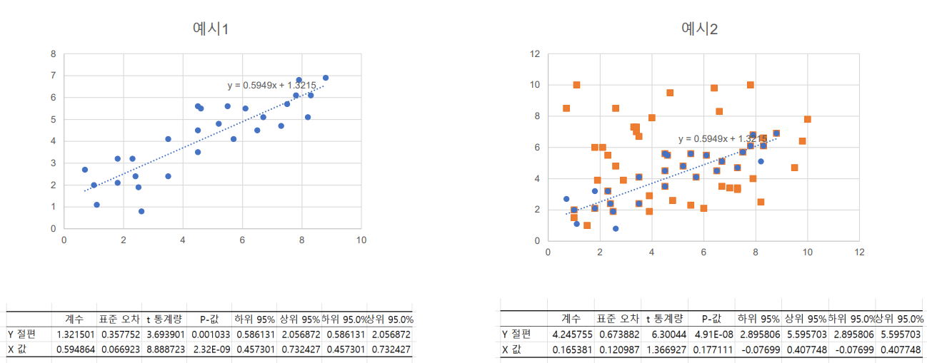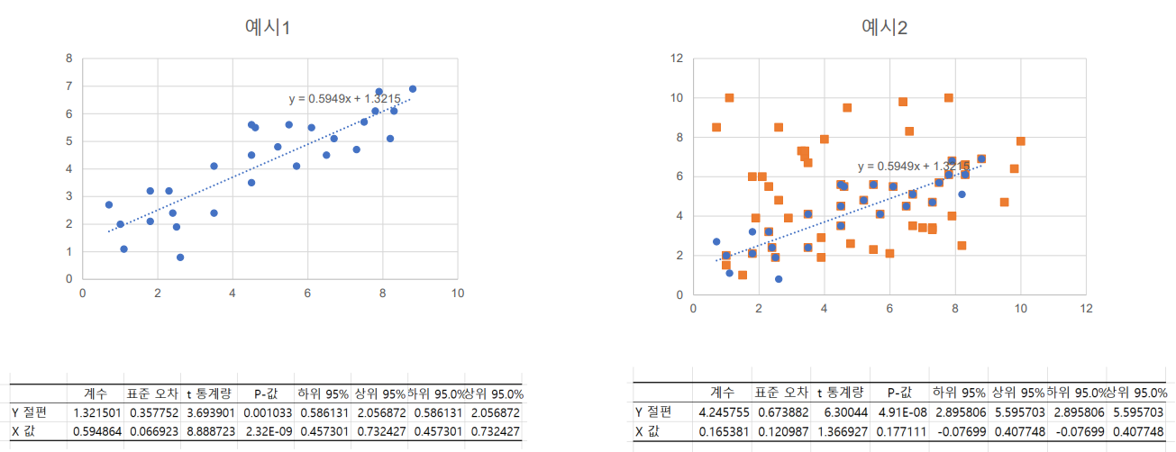 b) 등분산성이 벗어난 경우: 일반적인 회귀모형 사용 불가능, 등분산성 가정 위배
