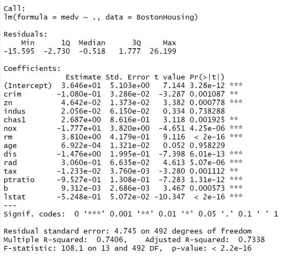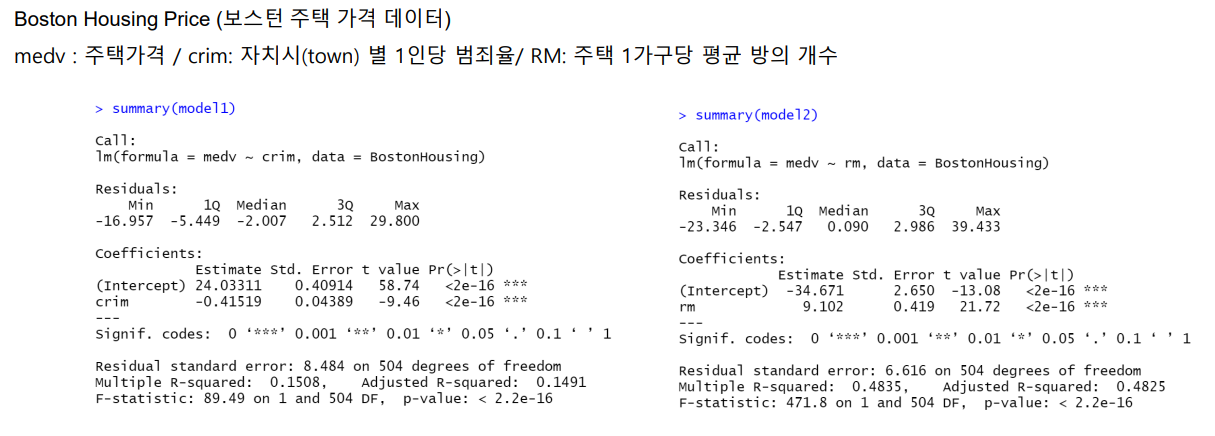 예시) 주택 가격 = 범죄율 + 주택1가구당 폋균 방의 개수 + ... + 모집단의 하위계층의 비율