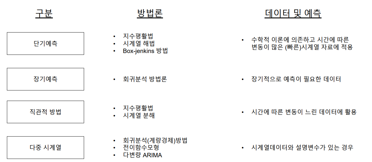 시계열분석(time series analysis): 시계열(시간의 흐름에 따라 기록된 것) 자료(data)를 분석하고 여러 변수들간의 인과관계를 분석하는 방법