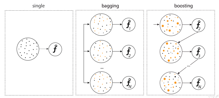 Bagging: boostrap aggregating의 약어로 데이터를 가방(bag)에 쓸어 담아 복원추출하여 여러 개의 표본을 만들어 이를 기반으로 각각의 모델을 개발한 후에 결과를 하나로 합쳐 하나의 모델을 만들어 내는 것
