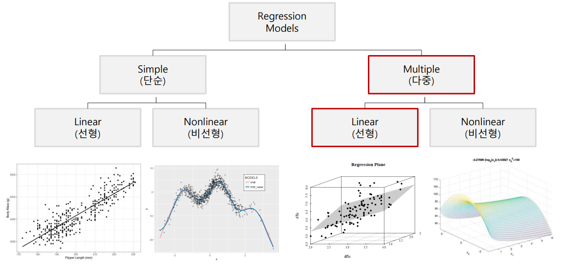 다항 회귀분석(polynomial regression): 독립 변수가 k개이고 반응 변수와 독립변수가 1차 함수 이상인 회귀분석