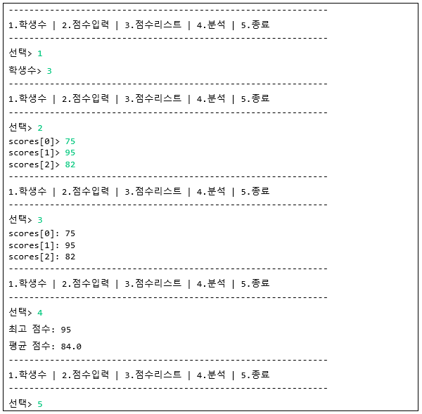 System.out.println(" 1. 학생수 | 2. 점수입력 | 3. 점수리스트 |4. 분석 | 5. 종료");