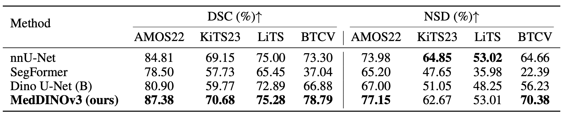 - DINO U-Net: DINOv3 기반에도 nnU-Net을 초과하지 못함, 계층적 CNN 디코더 의존성 때문으로 추정