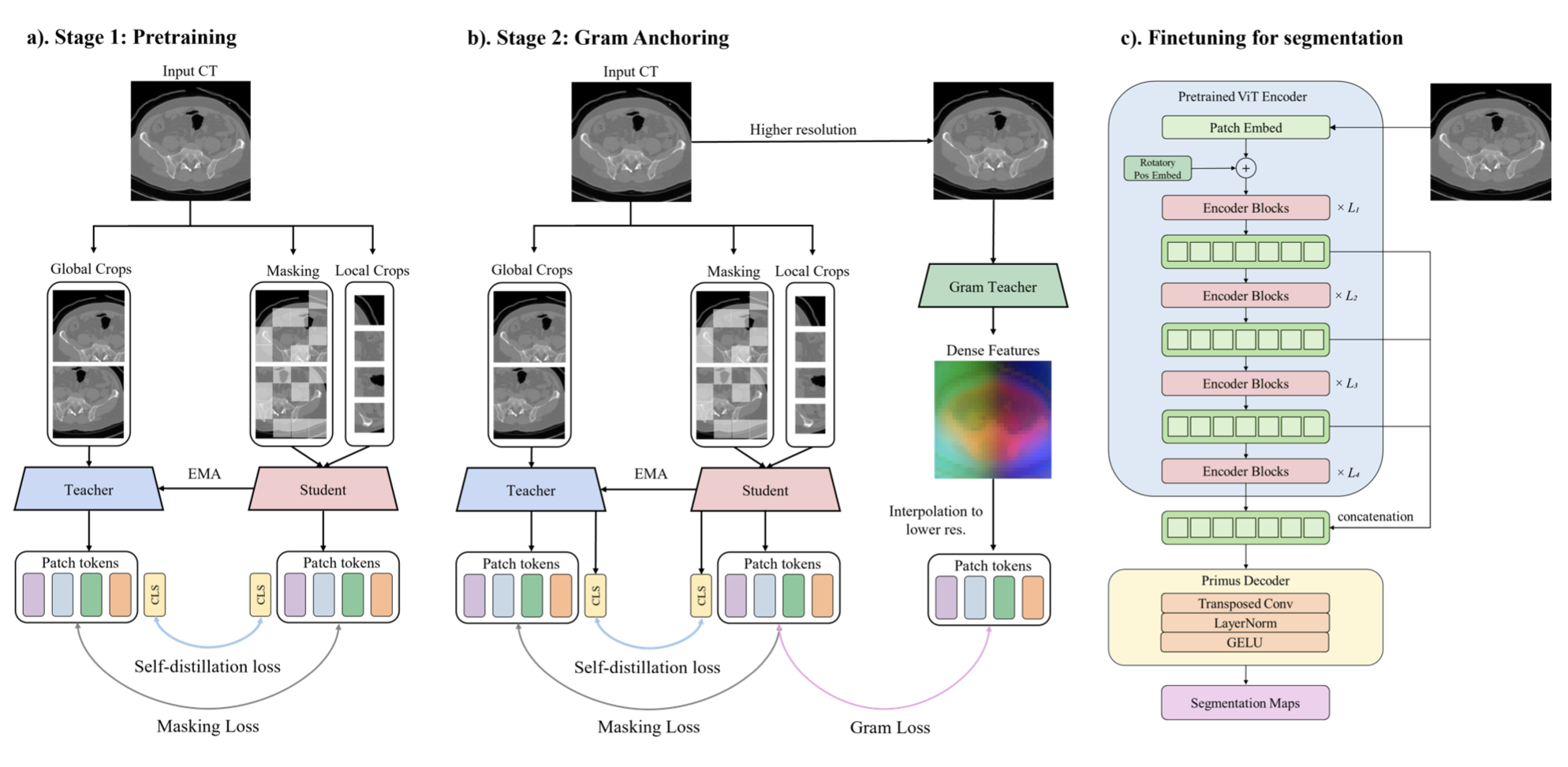 - Objective: 다양한 대규모 의료 이미징 데이터셋 CT-3M으로 MedDINOv3 사전 학습, 의료 이미징에 표현 정렬