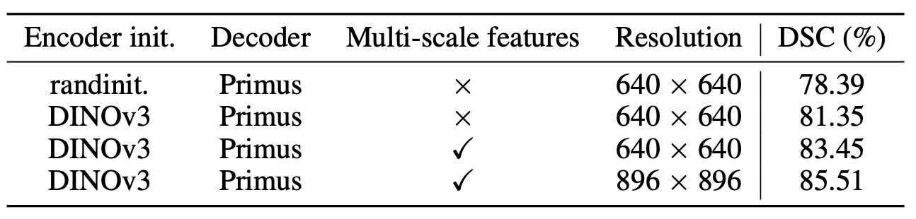 - DINOv3 ViT-B 인코더와 Primus 디코더(Transposed Convolution, LayerNorm, GELU 활성화로 구성) 사용