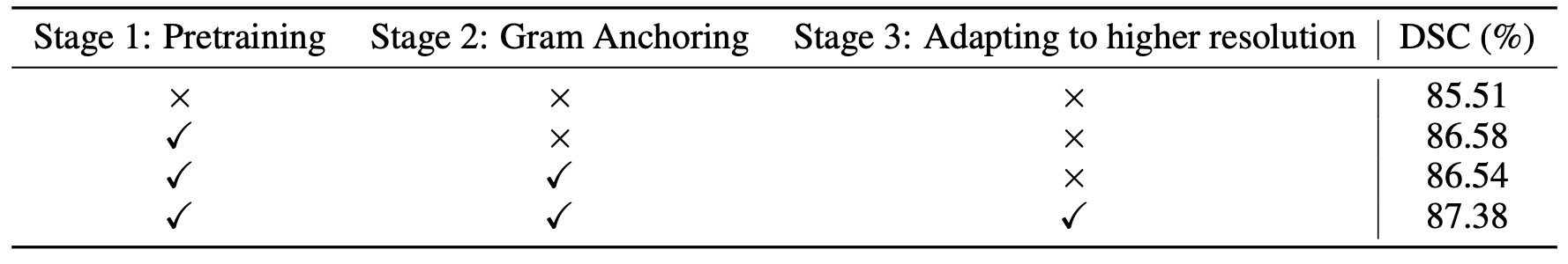 - Stage 2: Gram Anchoring 적용 시 추가 성능 향상 미미, Stage 1에서 패치 토큰 품질 저하가 적었기 때문으로 추정