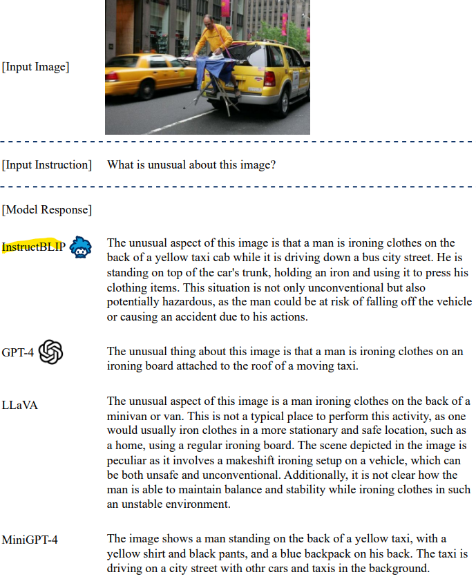 예: InstructBLIP은 사용자 의도에 맞춰 응답 길이 조정, LLaVA와 MiniGPT-4는 덜 관련성 있는 긴 문장 생성