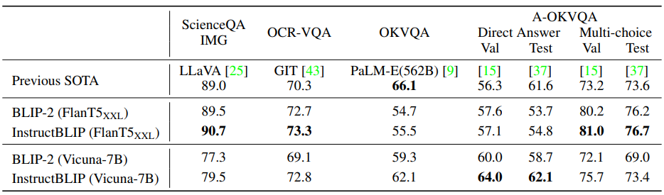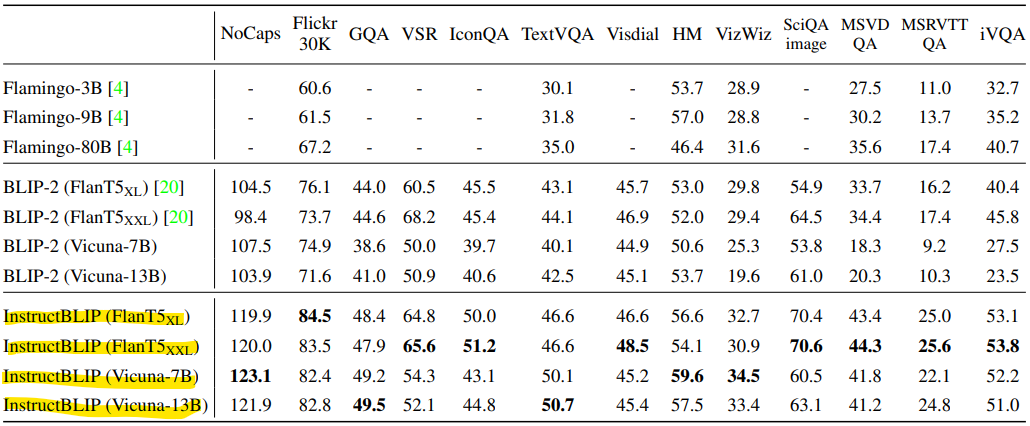 InstructBLIP은 원래 백본인 BLIP-2를 모든 LLM에서 큰 차이로 능가
