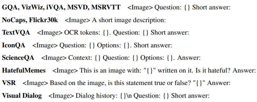 13개 Held-out 데이터셋에서 InstructBLIP 모델을 평가, Instruction 템플릿은 아래와 같음