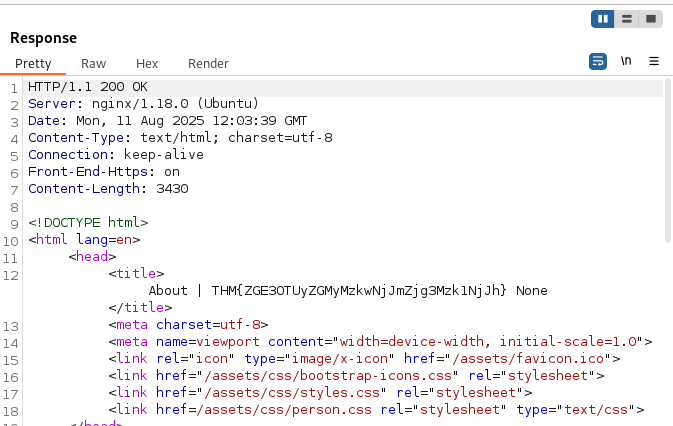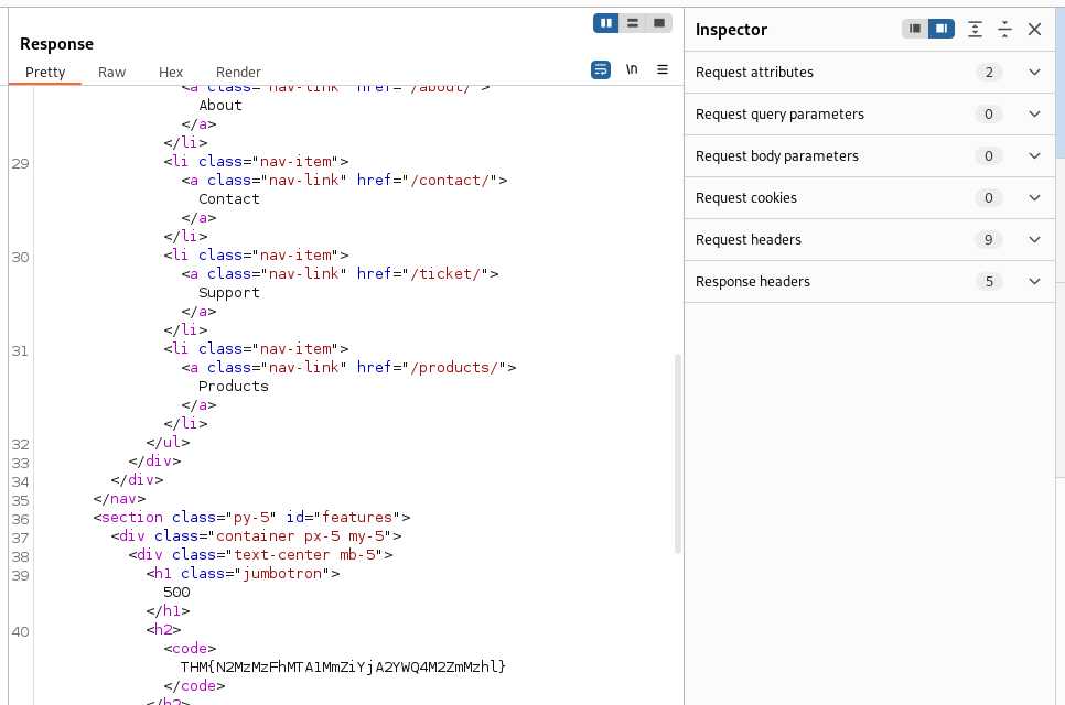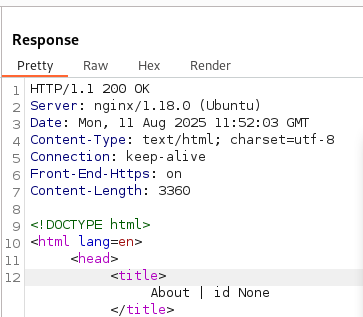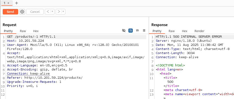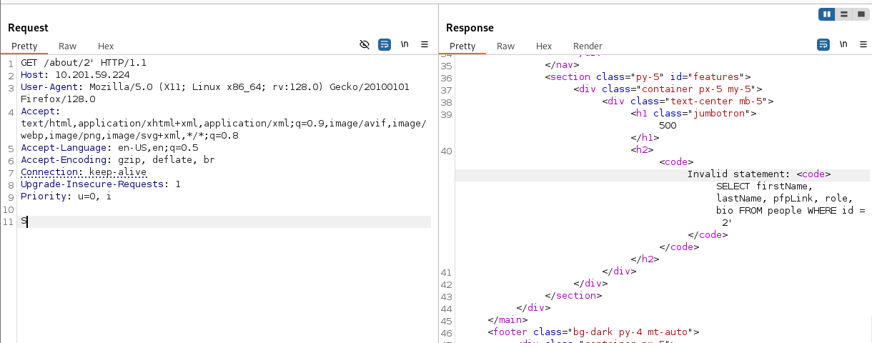 같은 이치로 http://10.201.59.224/about/2의 요청을 캡쳐해서 에러를 내보자.