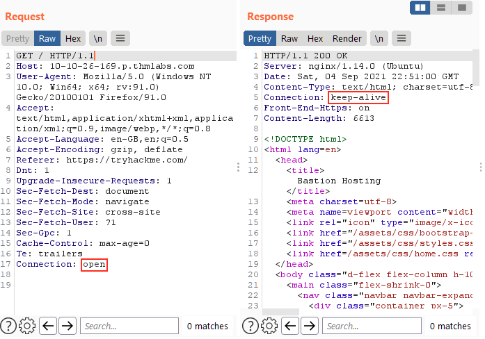 캡처된 요청을 Send 버튼을 통해 보내면 응답을 확인할 수 있다. 이미지처럼 Connection 헤더를 open으로 변경하면 응답 헤더의 값이 keep-alive로 바뀐 응답을 얻을 수 있다.