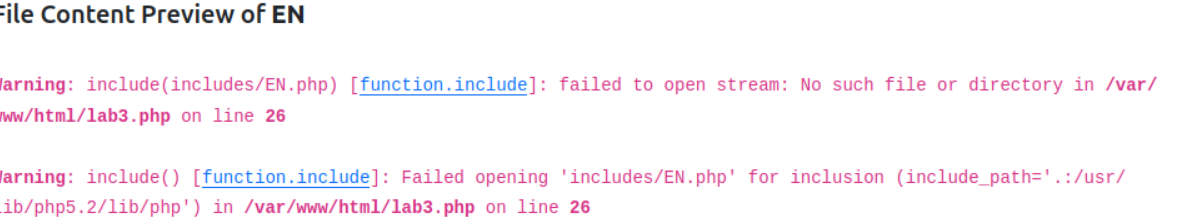 EN과 같은 검증되지 않은 입력을 하면 볼 수 있는데, include(includes/EN.php)라는 include 함수의 형식을 보여준다. 함수가 includes 디렉터리의 파일을 include하고 .php를 마지막에 첨부하고 있다.