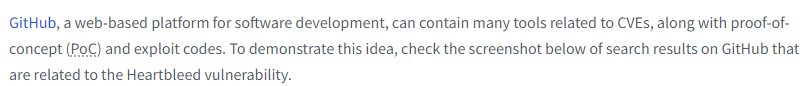 Github은 소프트웨어 개발 협업 플랫폼으로 CVE와 관련 도구, PoC 및 exploit 코드가 포함될 수 있다.