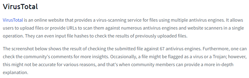 VirusTotal은 여러가지 antivirus 엔진을 사용하는 파일 등의 바이러스-스캔을 제공한다.