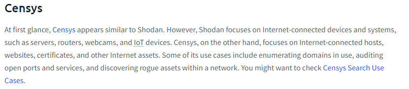 Censys는 인터넷에 연결된 호스트, 웹사이트, 인증서 등 기타 인터넷 자산에 초점을 둔다.