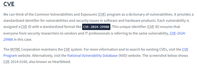 CVE는 취약점 사전으로 SW 혹은 HW에서 발견된 취약점과 보안 문제에 대해서 표준화된 확인을 제공한다.