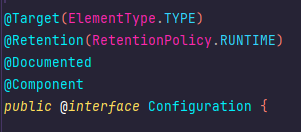 Bean 설정을 담당하는 클래스임을 나타내며, 하나 이상의 @Bean 메서드를 포함하는 클래스에 사용된다.