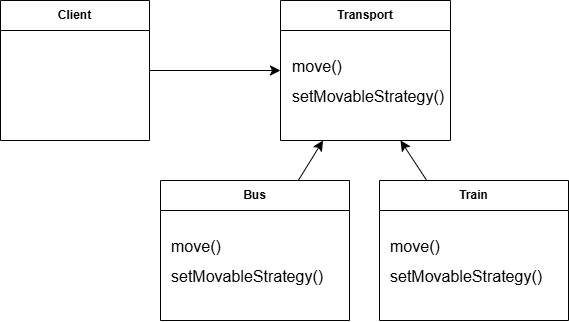 교통수단 클래스(Transport) 내에 전략 설정 메서드(setMovableStrategy)를 생성한다.