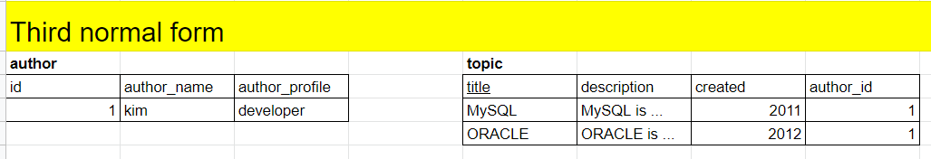 author_name과 author_profile은 author_id에 의존하고 있음. author_id는 title에 의존하고 있음.