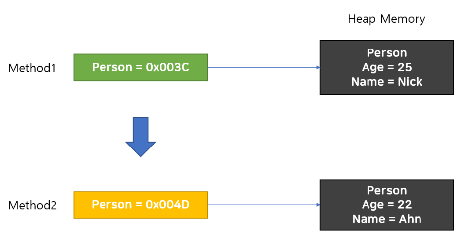 person = new Person(22, "Ahn"); // 새로운 객체 가리킴.