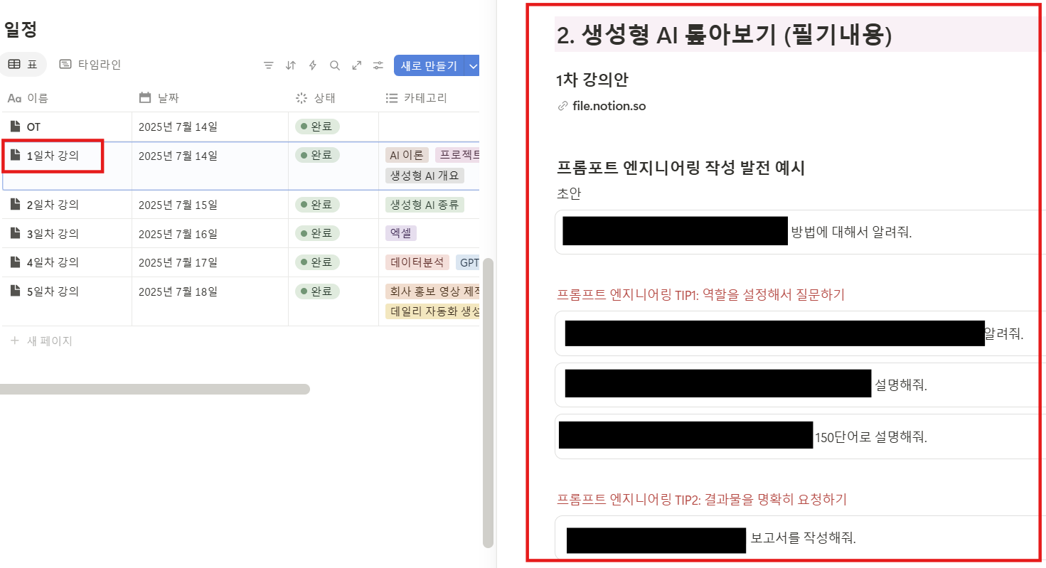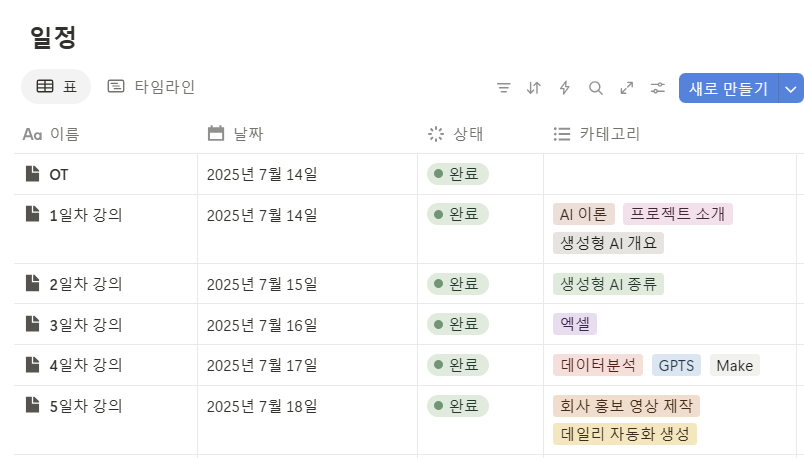 노션 데이터베이스를 사용해 일차별 필기 내용을 요약했습니다.