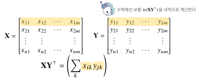 넘파이의 np.inner는 i번째 행벡터와 j번째 행벡터 사이의 내적을 성분으로 가지는 행렬을 계산합니다.