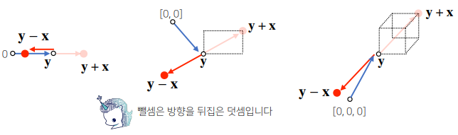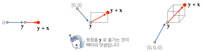 두 벡터의 덧셈은 다른 벡터로부터 상대적 위치이동을 표현합니다.